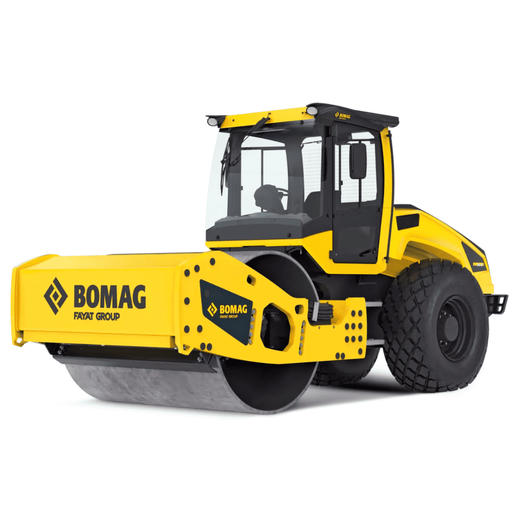 Rodillos de gran tamaño con todas las características necesarias para un trabajo cómodo y de calidad: cabina con luces de trabajo e indicadores e instrumentos, transmisión hidrostática de vibración y marcha, dirección articulada hidrostática, junta articulada de enganche, eje posterior con frenos gemelos, bloqueo diferencial No-Spin, bocina de aviso, única palanca para cambio de marcha y vibración, rascadores de contacto, parada de emergencia, alarma marcha atrás.